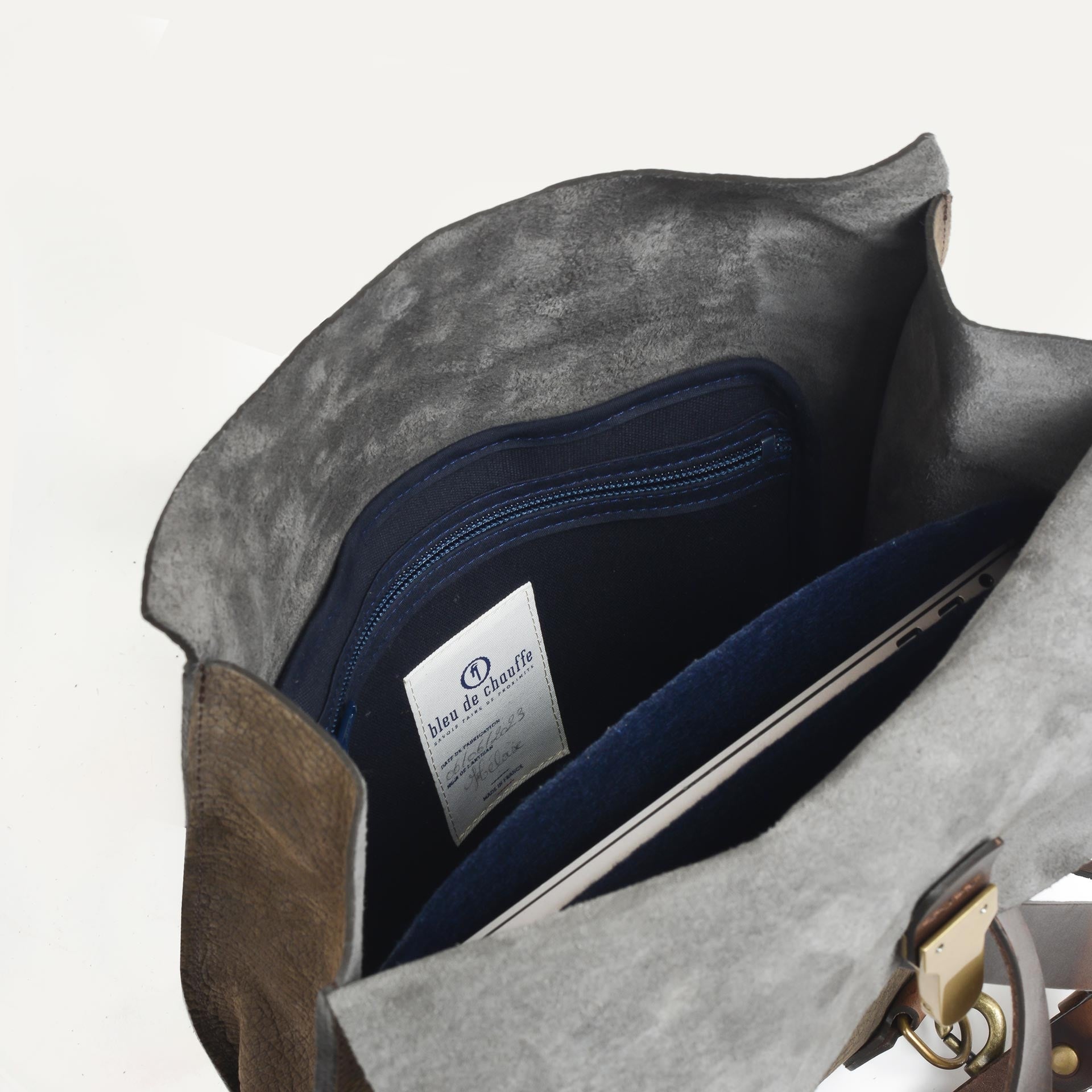 The Bleu de Chauffe label, signed and dated by the artisan who created the bag, is sewn on an inside zippered pocket.