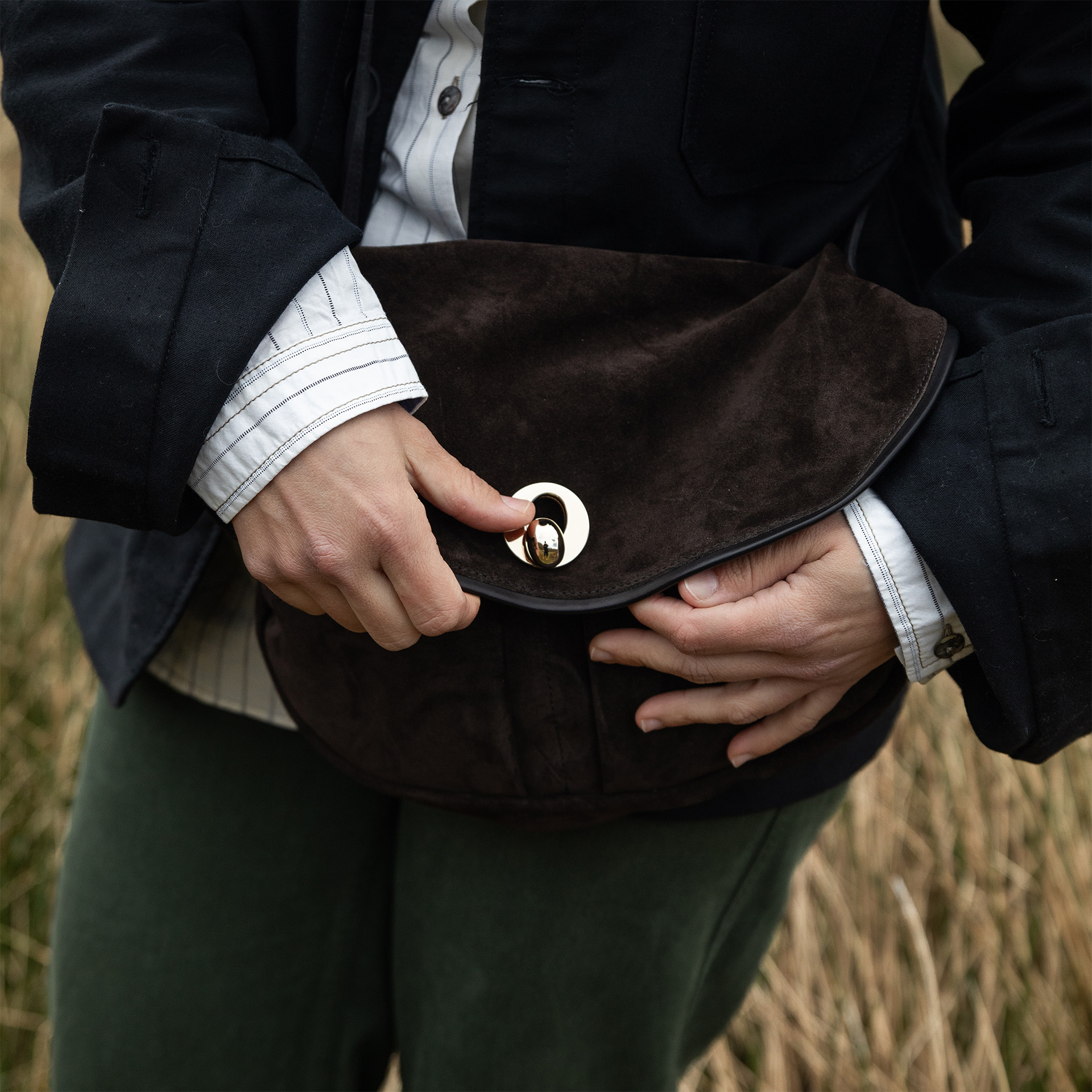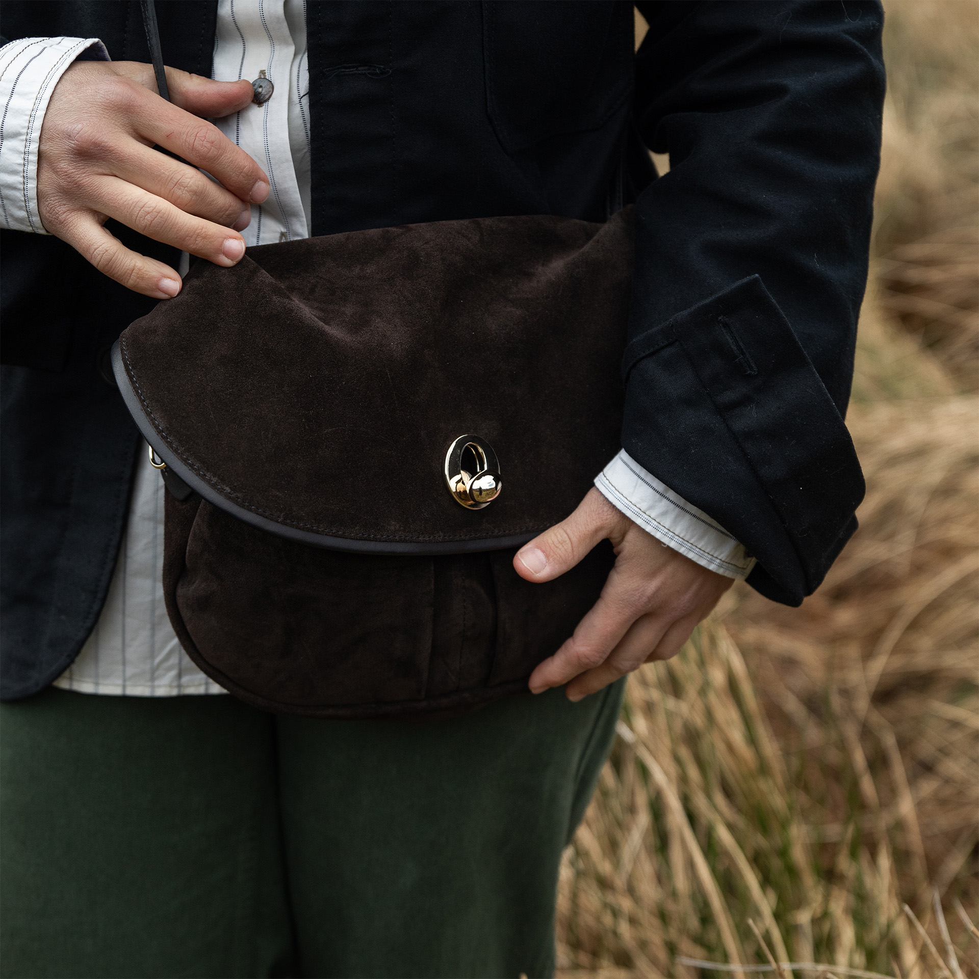 The vegetable-tanned leather details perfectly complement the suede leather. Treated without harsh chemicals, this leather is eco-friendly and develops a beautiful patina over time, gaining character and beauty. Vegetable tanning, a traditional and sustainable method, ensures exceptional durability while reducing environmental impact.