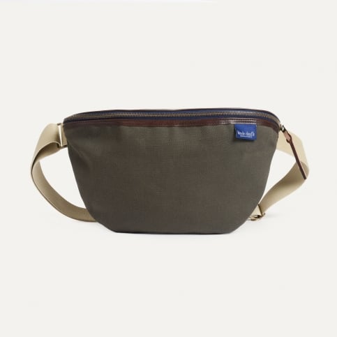 Ses empiècements en cuir tanné végétal ajoutent une touche d’élégance et d’authenticité, tandis que sa sangle large et ajustable garantit un confort optimal, même porté toute la journée.